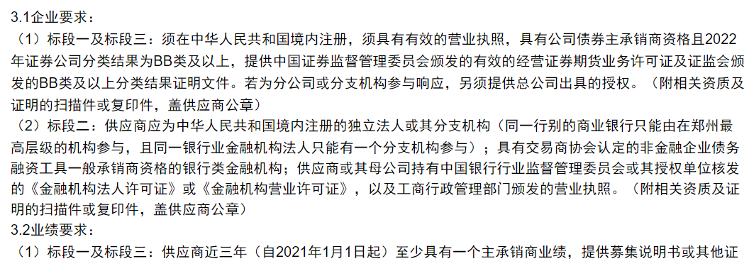 标段二:建立豫信电科2024-2026年债券发行承销商——银行类供应商库